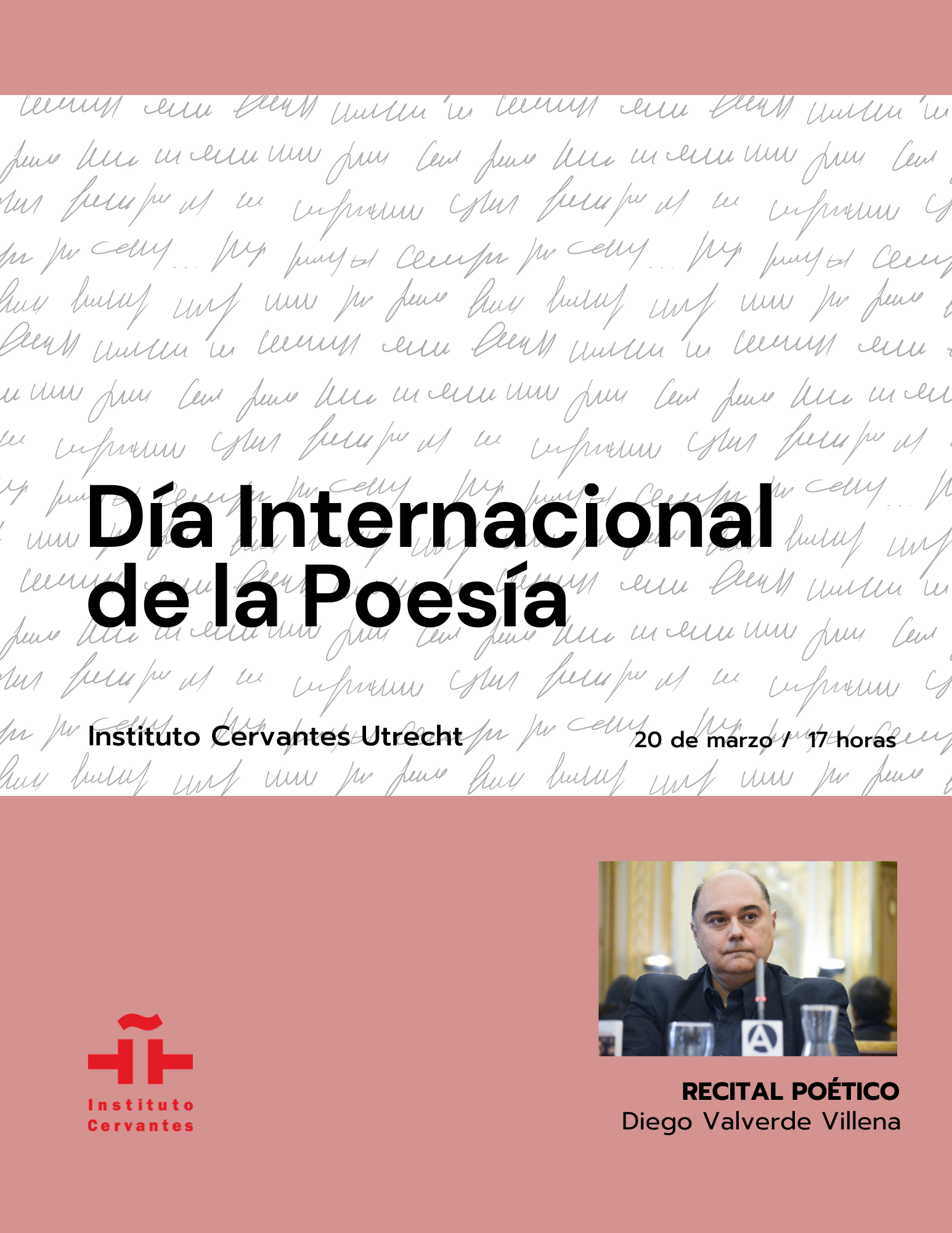 El IC Utrecht celebrará el Día Mundial de la Poesía con un recital del poeta Diego Valverde Villena. Será una lectura comentada, en la que el poeta nos contará cómo nacieron sus poemas y nos hablará de sus viajes, los libros que lo han marcado y sus variadas fuentes de inspiración. La lectura irá seguida de un coloquio con el poeta.